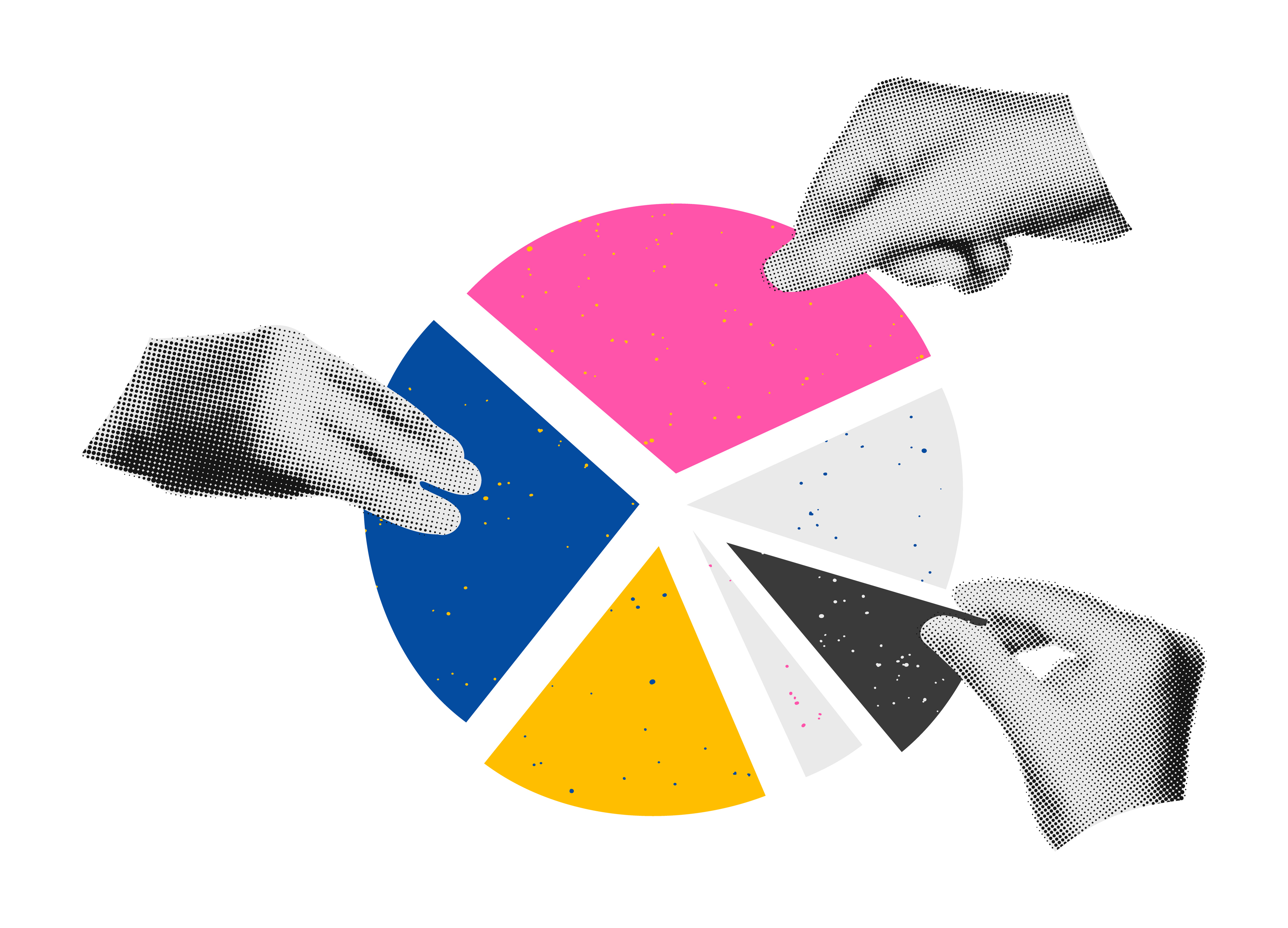 Halftone hands holding pie chart parts collage vector illustration